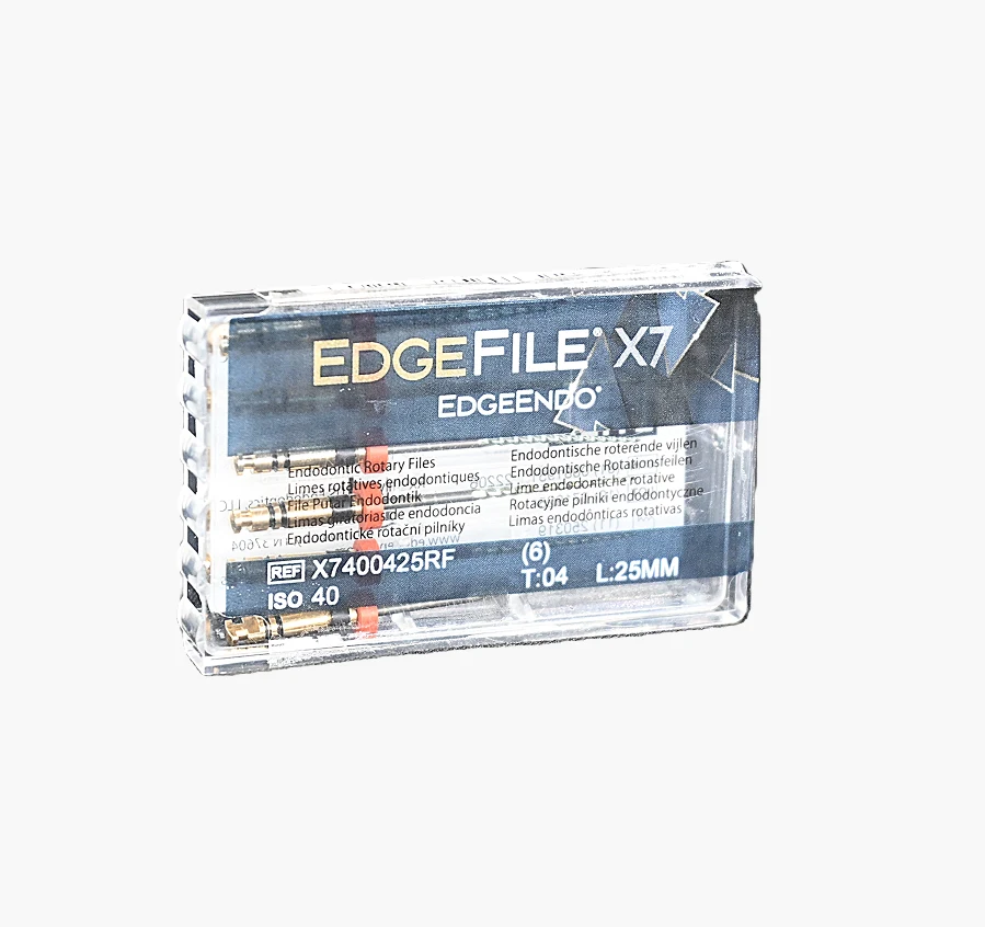 X7400425RF EDGEFILE X7 .04 #40 25MM  The EDGEFILE X7 .04 #40 25MM is a NiTi rotary file that has undergone heat treatment, specifically designed for shaping canals of medium length with wider apices. With a #40 tip, a taper of .04, and a length of 25mm, it provides accurate apical...